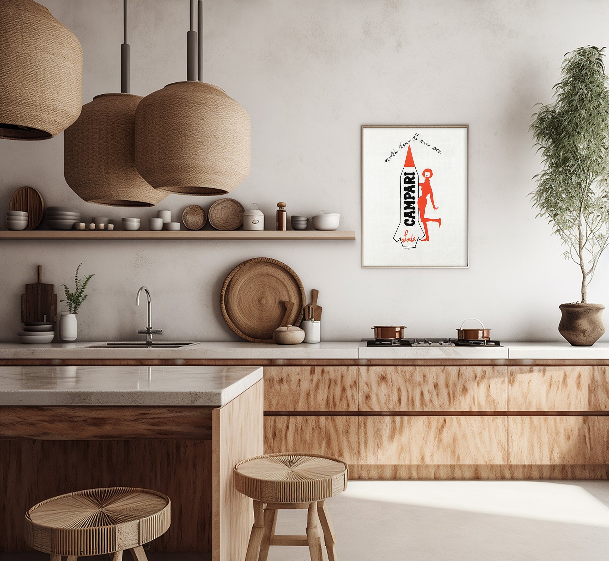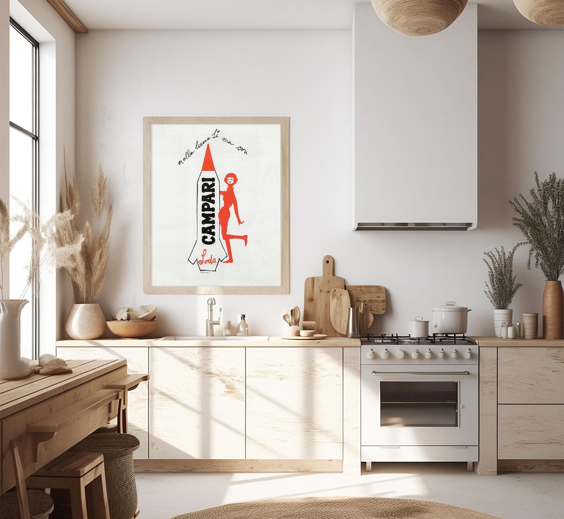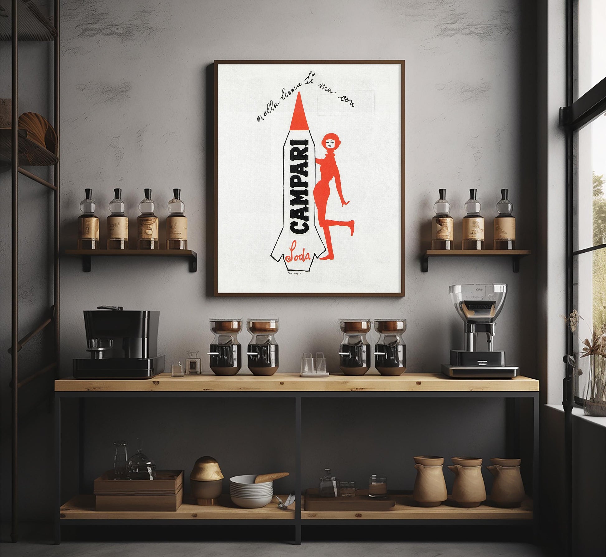 Launch your decor into the stratosphere with this delightful 1960s advertisement for Campari Soda. This piece by celebrated Italian artist Franz Marangolo perfectly captures the optimism and futuristic excitement of the Space Age.