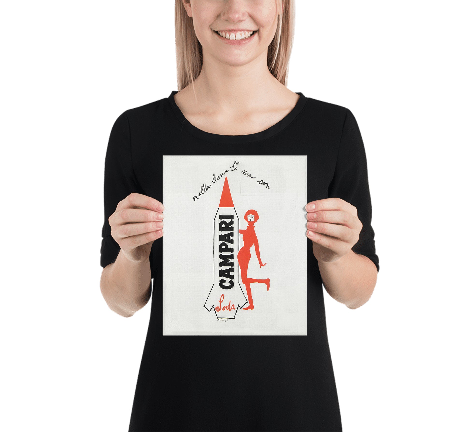 The artwork cleverly reimagines the iconic Campari Soda bottle as a rocket ship, ready for takeoff. Alongside it stands a stylish, robotic-looking figure, embodying the era's fascination with space exploration and modern design. The playful composition and charming Italian script create a sense of fun and adventure, brilliantly associating the classic Italian aperitivo with the promise and wonder of the future. This gallery-quality reproduction has been carefully restored to preserve the clean lines and minimalist charm of Marangolo's original artwork.